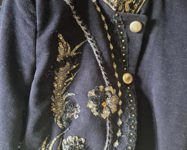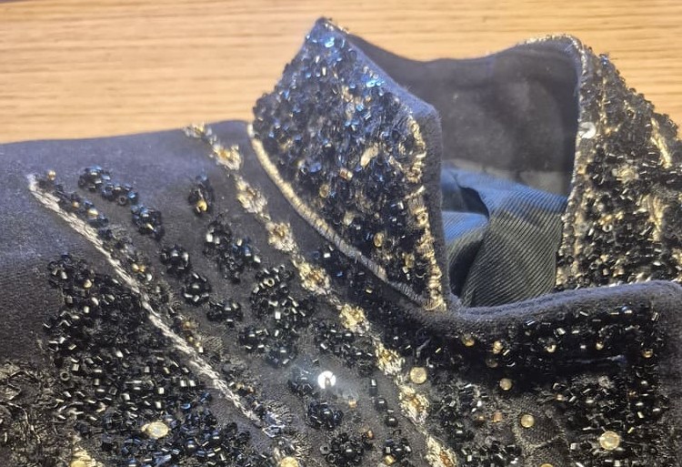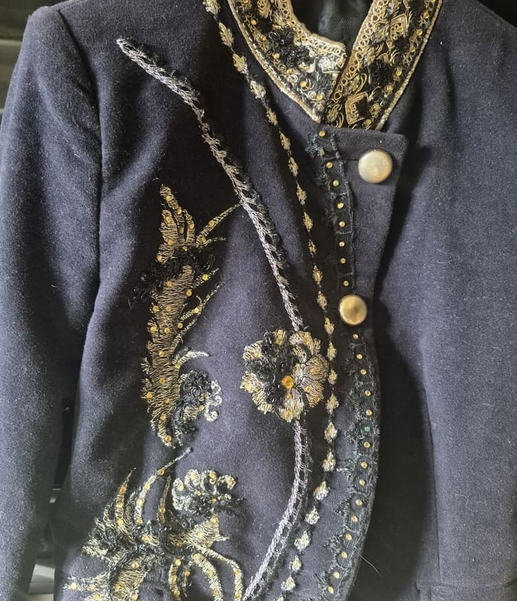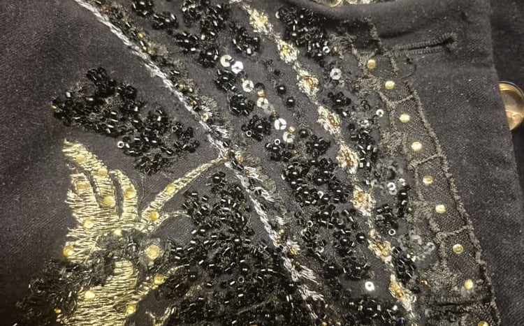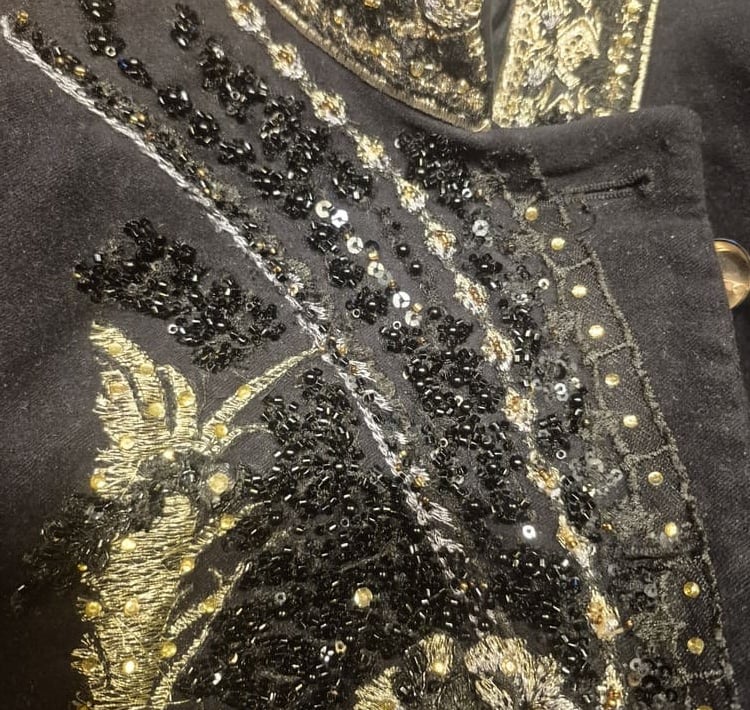 En tout, ce seront plus de 80 heures de travail qui ont été nécessaires à fabriquer cette veste, divisée en deux étapes. Une première, où je suis parti de la veste vide jusqu’à l’exposition de décembre dernier. Là, étaient posés les divers motifs et les grandes formes de perlage.