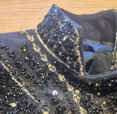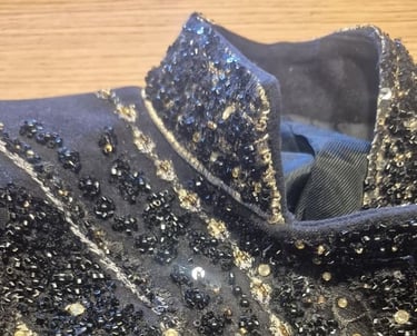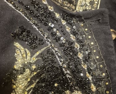 Description dVoilà la veste finie. Une pièce qui m’a fait avancer dans la rigueur et la force de travail. C’est une joie de voir les reflets de ce perlage dans le détail comme dans sa globalité. La régularité de la forme globale dissout les imperfections de détail. C’est cela qui me plait. Ne jamais faire pareil. Laisser la main découvrir les espaces nouveaux et les remplir comme ils arrivent. Pour former un tout, mêlant le précieux et le disparate. Retrouver dans la forme globale l’effet des broderies du XVIIIème. Première étape d’une série qui me fait plaisir.e l'article de blog :