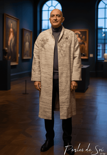 Les hommes sont encore plus timides que les femmes pour amener une touche personnelle, même discrète. Peu s’habillent vraiment. Pourtant, souvent, il ne suffirait pas de grand-chose pour tenter une personnification légère. Encore plus délicate, plus attentionnée que pour les femmes, le travail de broderie perlée peut être fait de quelques touches, de quelques lignes qui sont autant de forces à la ligne du vêtement ; Faites confiance à votre envie, et faites-moi confiance, après !
