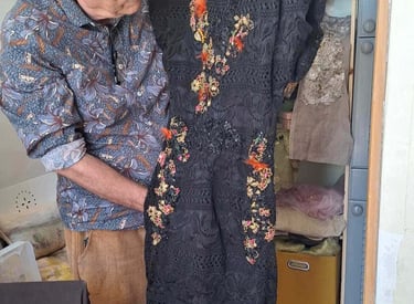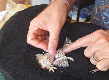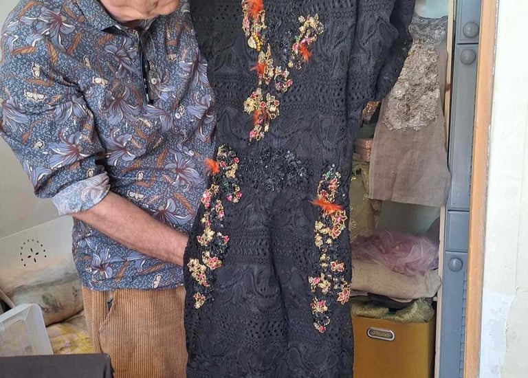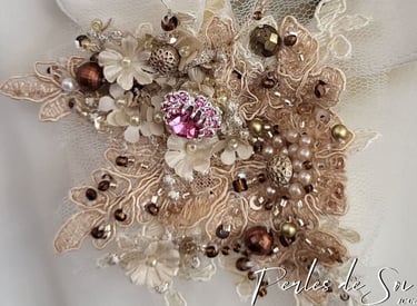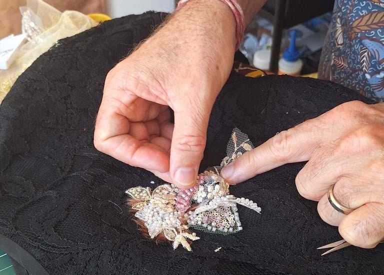 Au fil du temps, je me suis spécialisé dans un type de broderie ornementale, plus particulièrement dans la broderie perlée sur textiles. Cet art délicat exige patience, minutie, et une véritable connexion avec les matériaux. Chaque perle, tige, plume ou autre accessoire est choisi avec soin pour sa couleur, sa texture, et son éclat, puis patiemment fixé sur le tissu pour créer des motifs qui prennent vie sous les doigts.
