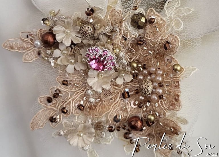 J'aime explorer les multiples possibilités offertes par les perles et toutes sortes d’ornementation : leur capacité à capter la lumière et à la restituer en un scintillement subtil, leur diversité de formes et de tailles qui permettent de jouer avec les volumes et les reliefs, et leur potentiel à transformer un simple tissu en une œuvre d'art unique et précieuse.