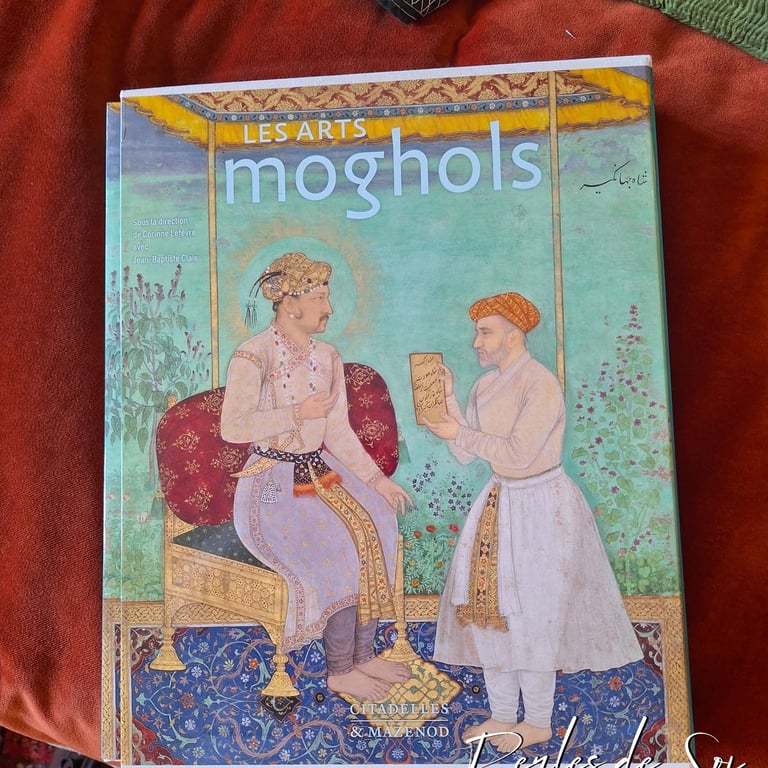 Chez moi, entre les fils chatoyants et les perles scintillantes, trône un ouvrage qui m'est cher : "Les Arts Moghols". Ce livre n'est pas qu'une simple référence ; c'est une porte ouverte sur un univers de raffinement et de magnificence, une source d'inspiration inépuisable qui nourrit mes créations en broderie perlée. Si la passion des voyages m'a conduit aux quatre coins du globe, c'est l'Inde, et plus précisément l'ère Moghole, qui a captivé mon âme d'artisan.